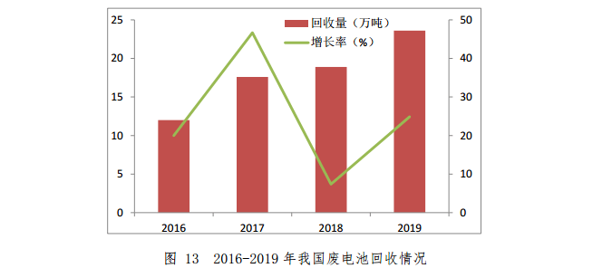 2019年,廢電池(鉛酸電池除外)回收量約 23.6 萬噸, 同比下降5.5%。其中,不能充電的一次電池回收量約2.5 萬 噸,能夠充電的二次電池回收量約21.1萬噸。2016-2019 年我國廢電池回收情況如圖 13 所示。