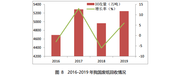 2019 年,我國廢紙回收量約 5244 萬噸,同比增長5.6%,廢紙回收率為 49.0%,廢紙利用率為 58.3%。在固體廢物進口政策影響下,進口廢紙量持續下滑,國內廢紙回收量呈上升趨勢。2016-2019 年我國廢紙回收情況如圖 8 所示。