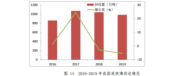 2019 年,我國廢玻璃回收量約 984 萬噸,同比下降5.4%。其中,廢平板玻璃回收量約591.6萬噸,占總回收量的60.1%,同比增長5.6%;廢日用玻璃回收量約 299 萬噸,占總回收量的 30.4%,同比下降 0.3%;其他類廢玻璃回收量約 93.3 萬噸,占總回收量的 9.5%,同比下降 48.2%。2016-2019 年我國廢玻璃回收情況如圖 14 所示。