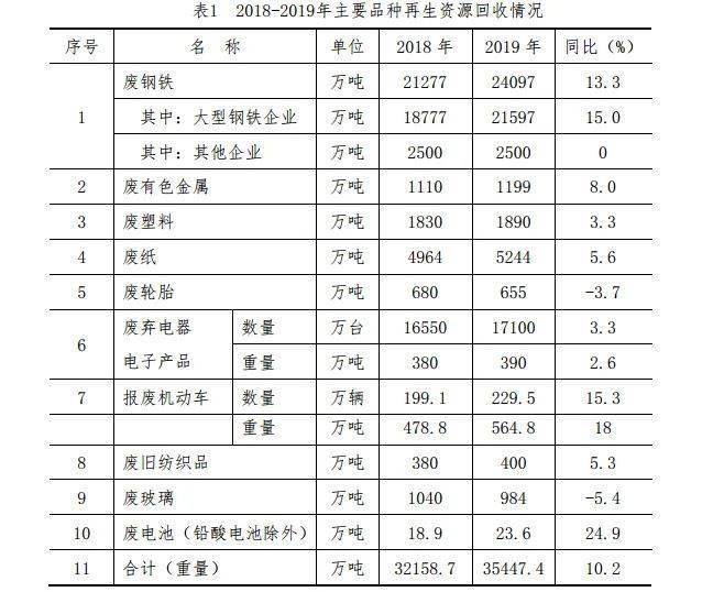 2019年,我國再生資源回收企業約10萬家,回收行業從業人員約1500萬人。截至2019年底,廢鋼鐵、廢有色金屬、廢塑料、廢輪胎、廢紙、廢棄電器電子產品、報廢機動車、廢舊紡織品、廢玻璃、廢電池十大品種的回收總量約3.54億噸,同比增長10.2%。2018-2019年主要品種再生資源回收情況如表1所示。