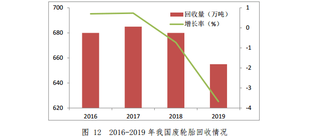 2019年,我國汽車輪胎產量為6.5億條,其中國內消耗約3.8億條。2019年,廢輪胎回收利用企業約1500家,從業人員約10萬人,回收量約2億條,回收重量約655萬噸,同比下降3.7%。其中,輪胎翻新量約500萬標準折算條,再生橡膠產量約300萬噸,橡膠粉產量約100萬噸,熱裂解處理量約100萬噸。2016-2019年我國廢輪胎回收情況如圖12所示。