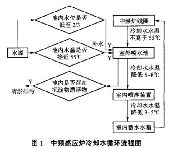 該冷卻系統(tǒng)以潛水泵為動力,噴水池和噴淋架為兩級冷卻裝置,以達到中頻爐冷卻水循環(huán)使用的目的。當水溫超過中頻爐冷卻要求<(55℃)及水量蒸發(fā)損失較多時,則由補水管路及時補充,同時及時排污,保持清潔。‘冷卻水池還可為噴水池周邊綠地灌溉,使水資源得到綜合利用。