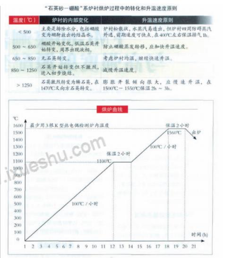烘爐與燒結爐襯是獲得優良高溫強度的一個重要環節。燒結工藝是根據石英砂的多晶轉化特性和爐子的容量決定的。必須指出的是,SiO2多晶轉變時十分緩慢的,即使烘爐燒結完成,那也是表層很薄一層,經過加厚至10mm~30mm,這與爐溫有關??烤o感應器為松散層,靠鐵水為燒結層,中間為過渡層。這一結構特性能防止透燒開裂,能保持爐襯整體性和可靠性,對不斷促使爐襯致密化是十分有益的,這是其他一般耐火材料所不具備的優點。烘爐燒結的要領是:低溫緩慢升溫,高溫滿爐燒結,爐料要求低碳少銹。整個過程分三個階段進行。1.烘爐階段。坩堝鋼模到達1100℃以前,必須緩慢加熱,以便硼酸中的結晶水(約占重量43%)和爐襯材料中的水分慢慢排出爐外。此外,還因為石英在573℃、867℃和1025℃時有多晶轉變,引起體積膨脹,在此區間緩慢加熱可以使局部膨脹應力分散開、裂紋少,故升溫速度以100℃/h~140℃/h為宜,需9h~12h。2.熔化階段。當坩堝鋼模溫度達1100℃~1200℃時陸續加入小塊冷料,為減小爐溫波動過大,每次投料不宜過多,以200㎏~400㎏左右為宜,當全部融化使鐵水面上升至爐口250mm左右為止。此階段前期(未熔化)功率較高,約為60%額定功率,可使爐料迅速升溫,降低爐襯溫差。待全部熔化前,應立即降低功率減少沖刷力繼續升溫,需時約5h以上。3.燒結階段。繼續升溫至1550℃左右后保溫2h~3h,以使爐襯在高溫形成具有足夠強度的硬殼,然后傾出全部鐵水,檢查爐襯表面燒結狀況,再返回1/2爐鐵水,加料連續熔化至少2~3爐方可停爐。在此階段中,由于爐襯中仍含有水汽,防止對感應圈絕緣的影響,爐襯強度較差,減少金屬液攪拌沖刷的危害,所以送電電壓不超過80%~90%額定電壓。4.保溫、冷卻。爐子保溫或空爐冷卻時,應蓋好爐蓋,周圍封嚴,減少供水量,以便爐襯緩慢冷卻達到均勻收縮,減少裂縫。并且爐子投產最初前三天內,非生產班次爐內應裝滿鐵水保溫,溫度控制在1300℃~1350℃。需要注意的是在進行測量時,爐溫低于500℃熱電偶要貼靠坩堝模,之后在移至爐膛中心,確保溫度測量準確性。5.烘爐曲線。需要注意的是:如采用廠家配置好的爐料,由于爐料的成分配比不盡相同,烘爐曲線要嚴格按照廠家提供的曲線進行升溫,確保爐料充分燒結,提高爐襯壽命。對于中頻爐爐襯的壽命:優質干凈的筑爐材料、合理配比,精心打結、科學烘烤與燒結是延長壽命的基礎;嚴格操作工藝同樣是延長爐子使用壽命的重要保障。