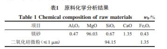 中頻爐爐襯作為感應(yīng)爐的重要組成部分,不但直接影響熔煉質(zhì)量,而且還影響生產(chǎn)成本。堿性爐襯具有抗堿性熔渣侵蝕的優(yōu)異性能,不污染鋼液,原料來源豐富,生產(chǎn)工藝簡單,使用方便等優(yōu)點(diǎn)。目前,以硼酸為燒結(jié)劑的堿性爐襯應(yīng)用廣泛,但由于硼酸的強(qiáng)烈助熔作用,導(dǎo)致爐襯的使用壽命短、熔煉成本高。本試驗(yàn)以二氧化硅微粉為燒結(jié)劑,利用其顆粒小、活性大、填???? 粉。該二氧化硅微粉是冶煉金屬硅或硅鐵時(shí),產(chǎn)生的揮發(fā)性SiO或Si氣體遇空氣迅速氧化而成的非結(jié)晶相無定形圓球狀顆粒,表面較為光滑,粒度小于1 μm的占87%以上,平均粒徑在0.2~0.3 μm,比表面積為19.2 m2/g,活性高。化學(xué)成分分析見表1。表1 原料化學(xué)分析結(jié)果