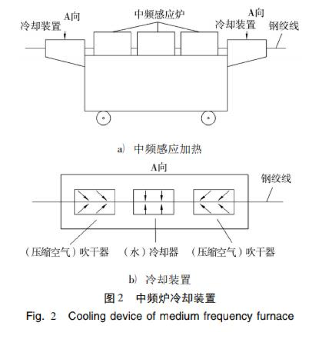 低松弛預應力混凝土用鋼絞線廣泛應用于高層 建筑、大跨度橋梁、核電站安全殼中[1]。由于預應 力鋼材的應力松弛,預應力混凝土結構中的應力值 逐漸下降,使結構達不到設計壽命而提前破壞[2]。 穩定化處理是鋼絞線獲得低松弛性能較普遍的一種 生產工藝,即鋼絞線在承受 30% ~ 50% 抗拉強度的 張拉力下,進行 350 ~ 400 ℃消除應力回火。經這種 方法處理的鋼絞線 70% 實際破斷力下連續 1 000 h 松弛值不大于 2. 5% 。 低松馳預應力鋼絞線生產工藝流程: 放線→鋼 絞線捻制→張力下回火( 穩定化處理) →冷卻→吹 干→收線。目前,穩定化處理均采用中頻感應加熱爐對鋼 絞線進行回火[3]。鋼絞線穩定化處理生產線使用 的中頻感應加熱爐為移動式,加熱爐兩端帶有冷卻 與吹干裝置,可以提高鋼絞線的成材率。