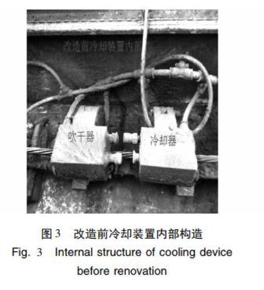 長期生產運行中,發現中頻爐兩端原 裝的冷卻裝置冷卻效果不佳,既影響產品質量,又易 造成鋼絞線整根斷裂,存在極大的安全隱患,對人身 和設備造成傷害。 正常生產的鋼絞線經冷卻后溫度不高于 60 ℃[4],而經中頻爐自帶的冷卻裝置一次自動冷卻后 的鋼絞線溫度仍然過高,約 150 ℃ 左右[5],如果此 時生產線啟動,將對此部分鋼絞線進行二次加熱,由 于溫度疊加,造成溫度急劇上升,使鋼絞線加熱溫度 過高,在 30% ~ 50% 抗拉強度的張拉力作用下易造 成鋼絞線整根斷裂。為避免此現象發生,必須由人 工操作,將中頻爐在位置1 與位置2 之間行走2 至3 次,才能將鋼絞線的溫度降至 60 ℃以下。這樣操作 既浪費時間也降低生產效率。而且由于需要反復多 次冷卻,中頻爐冷卻器、吹干器等相關部件使用頻次 增加,維護成本提高。 經反復查找,發現中頻爐原裝的冷卻裝置( 圖 3) 冷卻效果差與其冷卻器( 圖 4) 有關,原設計冷卻器與吹干器為銅制合頁式交錯咬齒形結構,該設計 存在以下問題: ( 1) 采用噴淋式冷卻,冷卻面積小。 ( 2) 冷卻器短,長度只有 135 mm。 ( 3) 冷卻水流量小,只有 16 個直徑為 1 mm 的 出水口。 ( 4) 冷卻器數量少,受設備總體布局的約束,中 頻爐兩端分別有一個冷卻器。 ( 5) 工作環境高溫、高油煙,冷卻器出水孔易堵 塞,不能正常工作。 ( 6) 生產線停止運行時,中頻爐由位置 2 向位 置 1 移動過程中,由于鋼絞線沒有張力,受重力作用 鋼絞線自然下垂造成冷卻器磨損。由于冷卻器結構 復雜難加工,因此制造成本高。