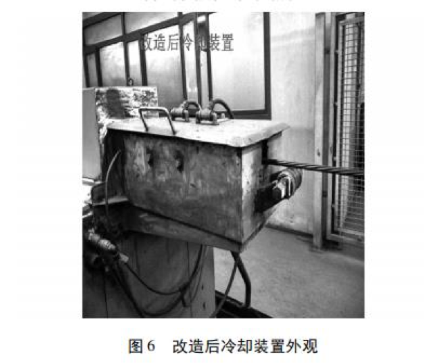 針對原中頻爐冷卻裝置存在的缺陷,經過研究 并結合多年的設備、生產及工藝方面的相關經驗,設 計出全新的 V 型直冷式可控大流量冷卻裝置。改 造后冷卻裝置內部結構如圖 5 所示,冷卻裝置外觀 如圖 6 所示。 改造后的冷卻裝置特點: ( 1) 新裝置采用加長 V 型水槽儲水冷卻,水槽將原來冷卻水管道直徑由 10 mm 增加到 16 mm,冷 卻水的供給量增大了 2. 5 倍。因為 V 型水槽容積 小能使冷卻水充分快速流動而帶走大量熱量,同時 由于儲水式冷卻能使鋼絞線始終浸泡在冷卻水中, 增大了冷卻的面積,只需一次冷卻即可將鋼絞線冷 卻至60 ℃以下,保證了冷卻的效果。 ( 2) 在冷卻裝置中加裝了導線輥,當生產線停 止運行時,中頻爐由位置 2 向位置 1 移動過程中,導 線輥與導線輪對下垂的鋼絞線起到支撐,避免鋼絞 線懸空,使鋼絞線不與噴氣吹干部分及 V 型冷卻水 槽接觸,不會對冷卻水槽產生磨損。 ( 3) 新的冷卻裝置與吹干裝置不會堵塞,完全 能在高溫、高油煙環境下正常工作,無需清理新的冷卻裝置與吹干裝置使用效果良好,適合所有規格鋼絞線的生產。改造成本低,使用壽命長。 既避免了鋼絞線整根斷裂,又消除了安全隱患,實現 了無人化操作,提高了鋼絞線的成材率和勞動生 產率。