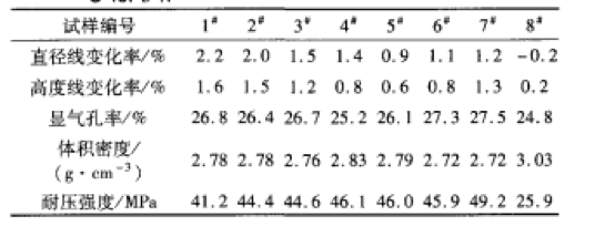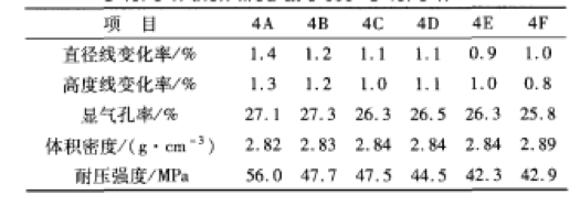 將所有試樣分別在1000、1200、1350和1600cI=熱處理3h后,觀察其燒結(jié)情況,同時(shí)將經(jīng)l350oC3h燒后的試樣4A一_4F再經(jīng)1600oC3h熱處理。對(duì)1600℃3h燒后的各試樣進(jìn)行直徑線變化率和高度線變化率(GB/T3997.1一l998)、體積密度(GB/T2997-2000)以及耐壓強(qiáng)度(GB/T5072-2008)檢測(cè),同時(shí)并對(duì)現(xiàn)場(chǎng)使用后的干式搗打料殘襯進(jìn)行顯微結(jié)構(gòu)觀察。