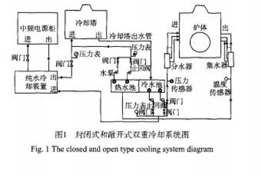例如圖1是封閉式和敞開式雙重冷卻系統原理圖,主要對中頻電源柜、爐體進行冷卻。爐體采用開放式水冷,中頻電源柜采用封閉式水冷。不論采取哪種冷卻方式,為了確保中頻爐生產過程的安全,這些冷卻水路中都必須設有水溫、水樂監測報警裝置。