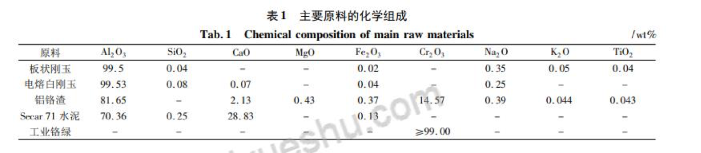 實驗用主要原料有板狀剛玉( 5 ~ 3 mm、3 ~ 1 mm、1 ~ 0 mm 和≤0. 088 mm) 、電熔白剛玉( 5 ~ 3 mm、3 ~ 1 mm、1 ~ 0 mm 和≤ 0. 088 mm) 、鋁鉻渣( 5 ~ 3 mm 、3 ~ 1 mm、1 ~ 0 mm 和≤ 0. 088 mm) 、純鋁酸鈣水泥( Secar 71) 、磷酸溶液( 濃度 60% ) 和工業鉻綠。板狀剛玉體積密度 5. 53 ~ 5. 57 g·cm - 3,吸水率為 1. 0% ~ 1. 09% ,顯氣孔率約 4. 1% ~ 4. 8% ; 電熔白剛玉體積密度 3. 54 ~ 3. 70 g·cm - 3,吸水率為 2. 43% ~ 2. 58% , 顆粒料的顯氣孔率約 6. 1% ~ 7. 4% ; 鋁鉻渣顆粒體積密度為3. 29 ~ 3. 37 g·cm - 3,吸水率為 4. 2% ~ 4. 6% , 顯氣孔率 10. 3% ~ 12. 1% 。原料的化學組成見表 1。