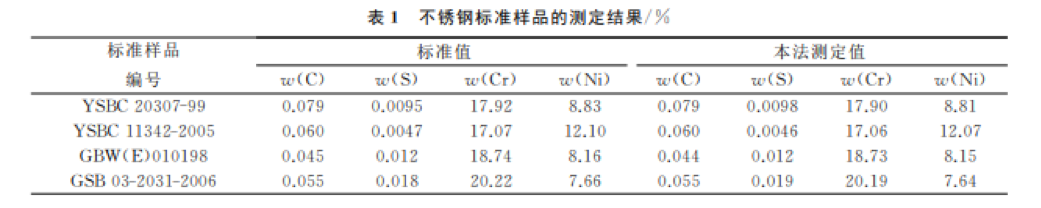 選取4個不銹鋼標準樣品,按本方法分析步驟進行測定,結果如表1所示。