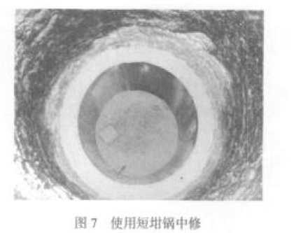2009 年 4 月進(jìn)行了第二次試驗(yàn)。在整個(gè)中頻爐開爐過 程中,有過 5 次較長(zhǎng)時(shí)間的停爐,中頻爐爐膛未出現(xiàn)大裂 紋。在爐齡 25 爐次時(shí),進(jìn)行第二次燒結(jié),燒結(jié)工藝是 在燒結(jié)溫度保溫 2h。在爐齡 42 爐次時(shí),在爐襯中下 部出現(xiàn)較大的燒蝕區(qū),進(jìn)行第一次中修,中修工藝是 使用短坩鍋和爐襯材料修筑爐膛底部,經(jīng)過短暫燒 結(jié)后正常開爐(圖 4)。在爐齡 69 爐次時(shí),爐膛情況正 常(圖 5),使用短坩鍋進(jìn)行第二次中修。在爐齡 79 爐 次時(shí),因中頻爐設(shè)備原因停止試驗(yàn),爐膛良好。