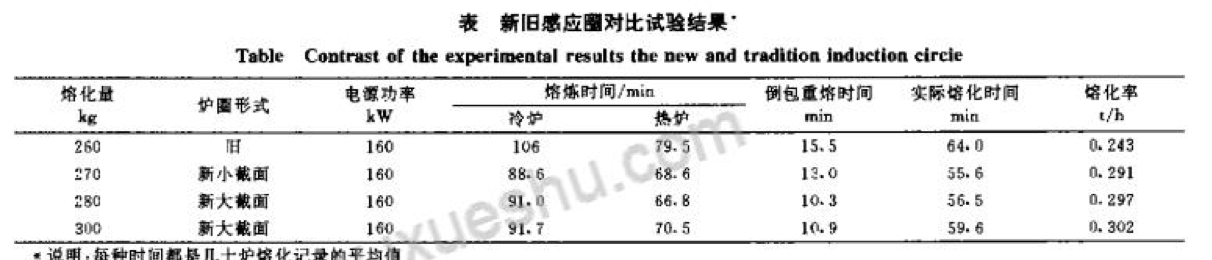 經(jīng)過(guò)更換中頻電爐感應(yīng)圈,改接電容器,完成了電爐的改造。在清華大學(xué)機(jī)械廠沙河分廠進(jìn)行了新舊爐型的對(duì)比試驗(yàn)。熔化材料為玲激合金鑄鐵,鐵水溫度1480℃。試驗(yàn)結(jié)果見下表。